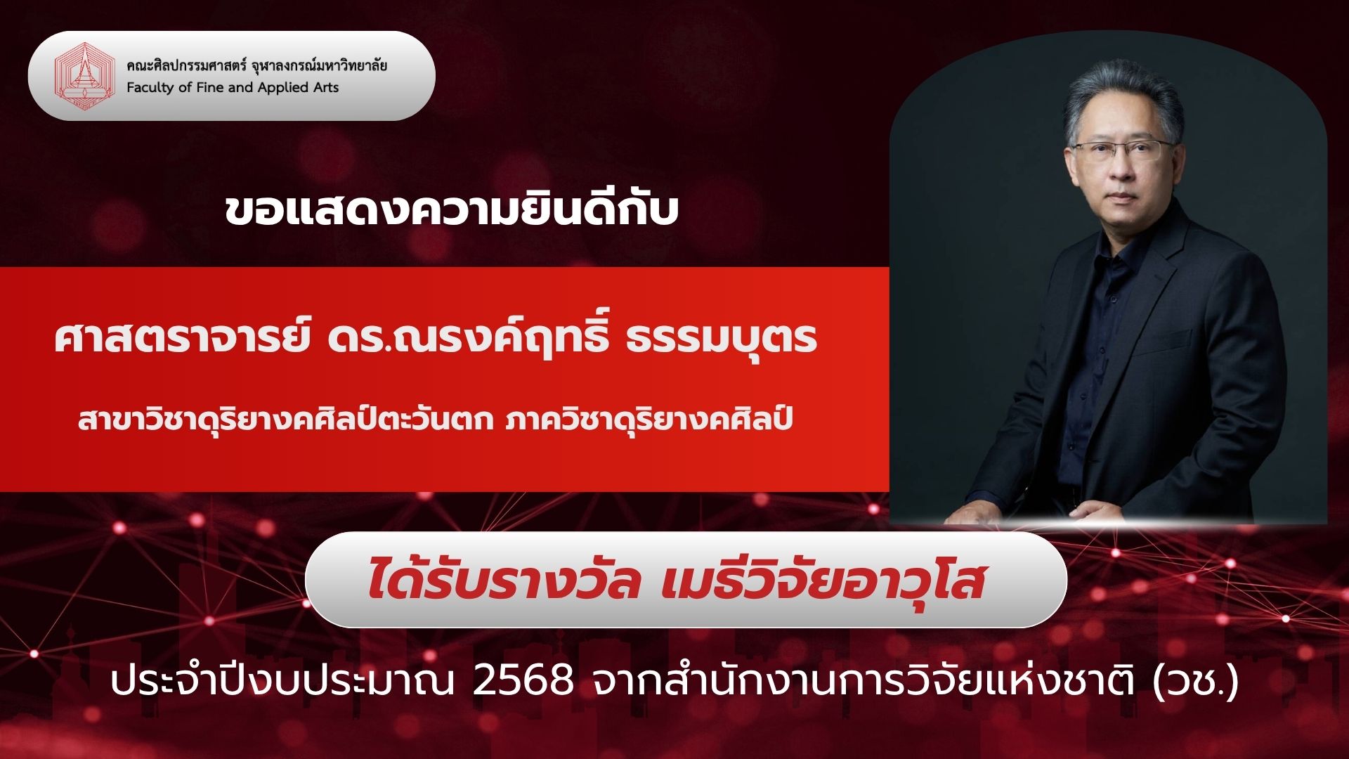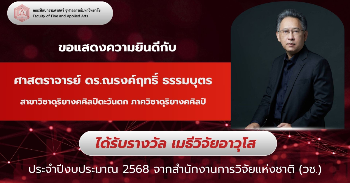 ขอแสดงความยินดีกับ ศาสตราจารย์ ดร.ณรงค์ฤทธิ์ ธรรมบุตร (ศิลปินแห่งชาติ) เนื่องในโอกาสได้รับรางวัลทุนเมธีวิจัยอาวุโส ประจำปี 2568 ณ มหกรรมงานวิจัยแห่งชาติ 2568 ( Thailand Research Expo 2025) จัดโดย สำนักงานการวิจัยแห่งชาติ (วช.) กระทรวงการอุดมศึกษา วิทยาศาสตร์ วิจัยและนวัตกรรม และหน่วยงานเครือข่ายในระบบวิจัยทั่วประเทศ