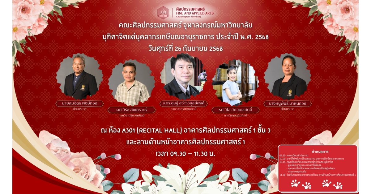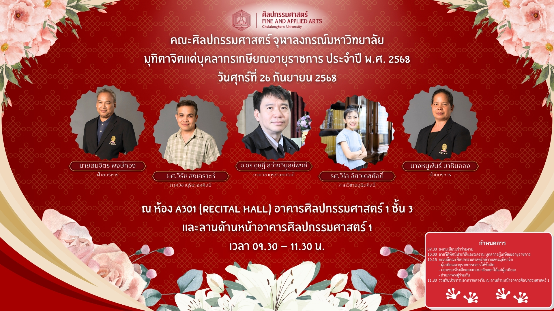 คณะศิลปกรรมศาสตร์ จุฬาลงกรณ์มหาวิทยาลัย ขอเรียนเชิญคณาจารย์ นิสิตปัจจุบัน นิสิตเก่า และบุคลากร เข้าร่วมพิธีแสดงมุทิตาจิตแด่บุคลากรเกษียณอายุราชการ ประจำปี 2568 ในวันศุกร์ที่ 26 กันยายน 2568 เวลา 09.30–11.30 น. ณ ห้อง A301 อาคารศิลปกรรมศาสตร์ 1