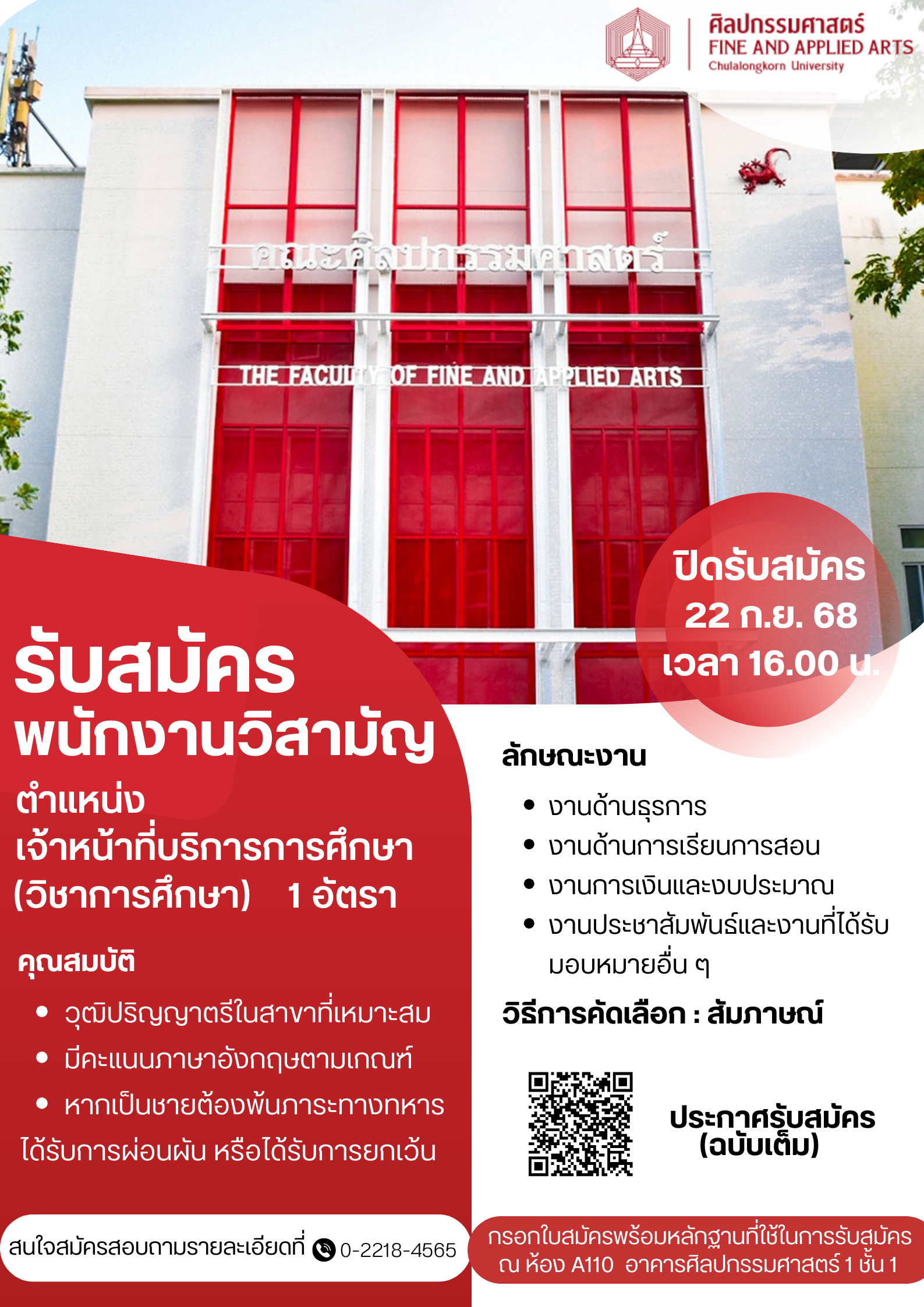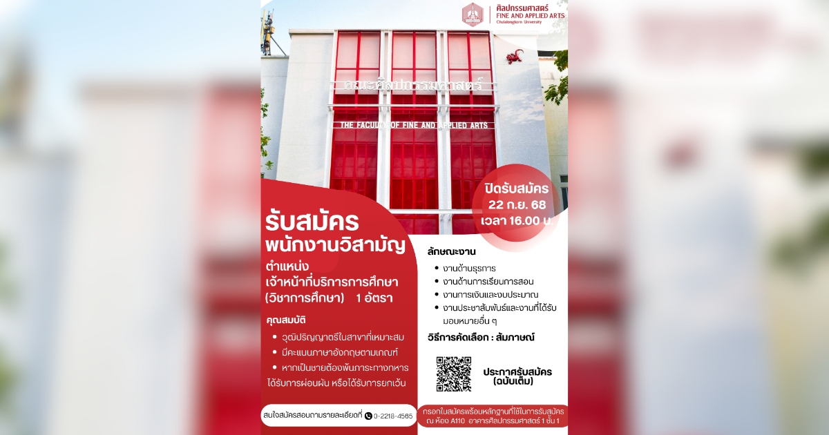 คณะศิลปกรรมศาสตร์ จุฬาลงกรณ์มหาวิทยาลัย เปิดรับสมัครพนักงานวิสามัญ ตำแหน่ง เจ้าหน้าที่บริการการศึกษา (วิชาการศึกษา) จำนวน 1 อัตรา