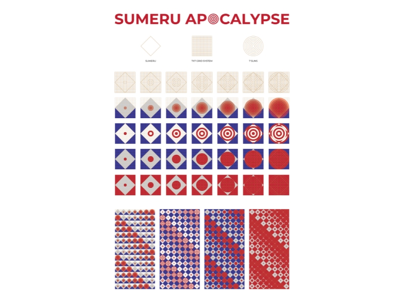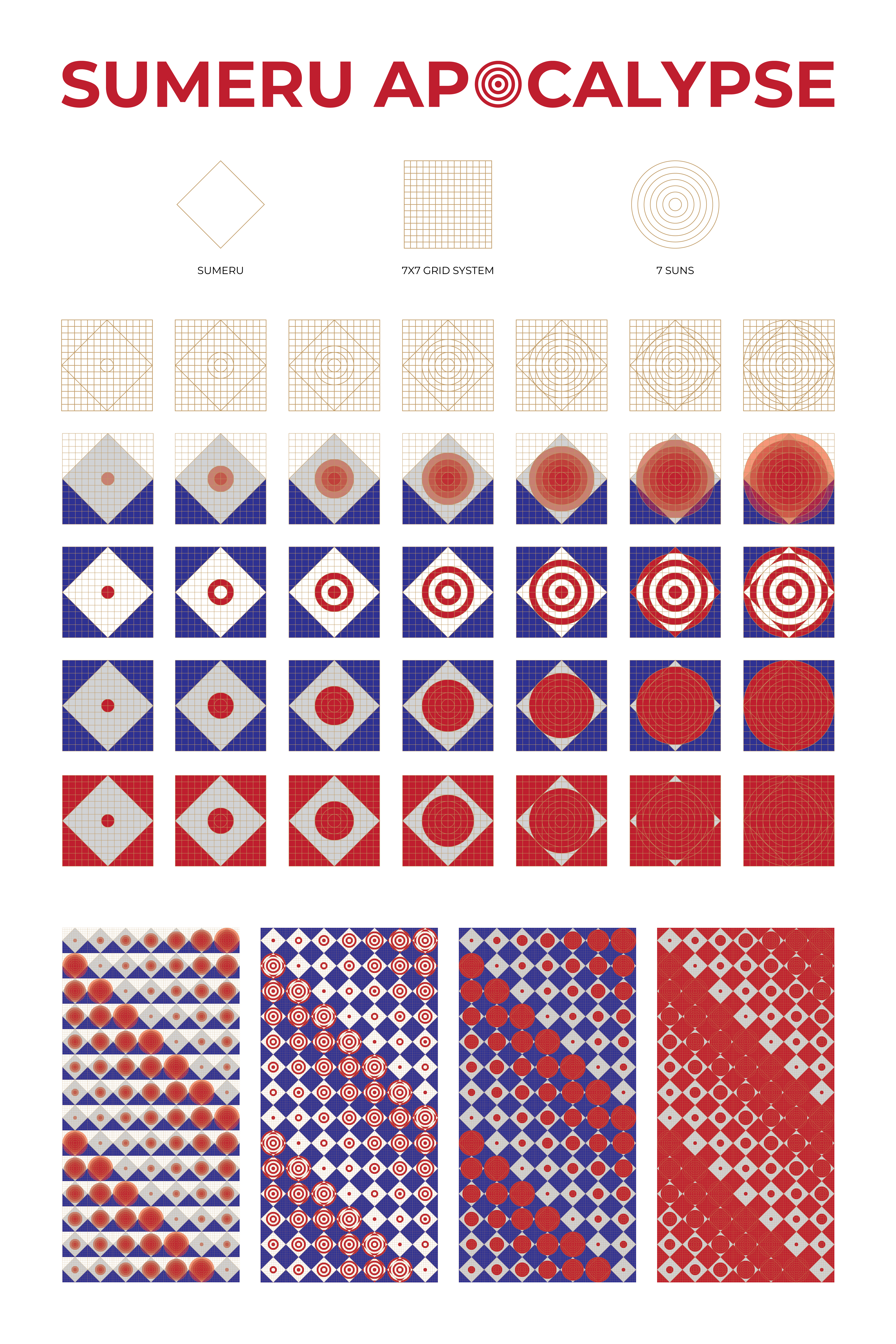 กระบวนการออกแบบเริ่มด้วยการทบทวนวรรณกรรมจากสื่อสิ่งพิมพ์และออนไลน์เพื่อศึกษาเกี่ยวกับความเชื่อของวันสิ้นโลกในความเชื่อแบบศาสนาพุทธ วิเคราะห์ข้อมูล และต่อยอดสู่งานออกแบบ ผู้ออกแบบใช้กริดทรงกลมเรขาคณิต 7 วงที่ซ้อนทับกันแทนดวงอาทิตย์ทั้ง 7 ดวงที่จะปรากฎขึ้นเมื่อโลกถึงจุดสิ้นสุดที่วางอยู่บนกริดทรงสี่เหลี่ยมข้าวหลามตัดด้านเท่าแทนความหมายถึงเขาพระสุเมรุเพราะเป็นยอดเขาที่มียอดชี้ขึ้นบนส่วนปลายที่ชี้ลงล่างนั้นเปรียบได้กับเงาที่สะท้อนบนผิวสีทันดรมหาสมุทร กริดวงกลมและกริดทรงสี่เหลี่ยมข้าวหลามตัดด้านเท่านั้นถูกวางสัดส่วนบนกริดตารางที่มีสัดส่วน 7X7 จากการที่เลข 7 นั้นมีความสัมพันธ์กับพระพุทธศาสนาในหลากหลายมิติ ยกตัวอย่างเช่น จำนวนของภูเขาที่ล้อมรอบเขาพระสุเมรุ จำนวนก้าวของพระโพธิสัตย์เมื่อคลอดจากครรภ์พุทธมารดา จำนวนหลักธรรมที่เป็นทางแห่งการตรัสรู้หรือโพชฌงค์ 7 ต่อมาผู้ออกแบบได้ทดลองออกแบบลวดลายจากระบบกริดแสดงความเป็นไปได้ในการสร้างงานออกแบบกราฟิกใน 7 แนวทางจากระบบกริดเดียวกันนี้ และนำไปจัดแสดงต่อสาธารณชนเพื่อหาแนวทางพัฒนาการออกแบบ ณ งาน INTERNATIONAL YOUTH ART EXCHANGE EXHIBITION จากนั้นจึงได้นำคำแนะนำจากผู้ชมงานไปวิเคราะห์ พัฒนา ต่อยอดและได้มาซึ่งงานออกแบบลวดลาย 4 ลวดลาย รวมทั้งตราสัญลักษณ์แบรนด์สินค้าที่ได้แรงบันดาลใจจากรูปทรงของดวงอาทิตย์ทั้ง 7 ดวงที่ซ้อนทับกัน