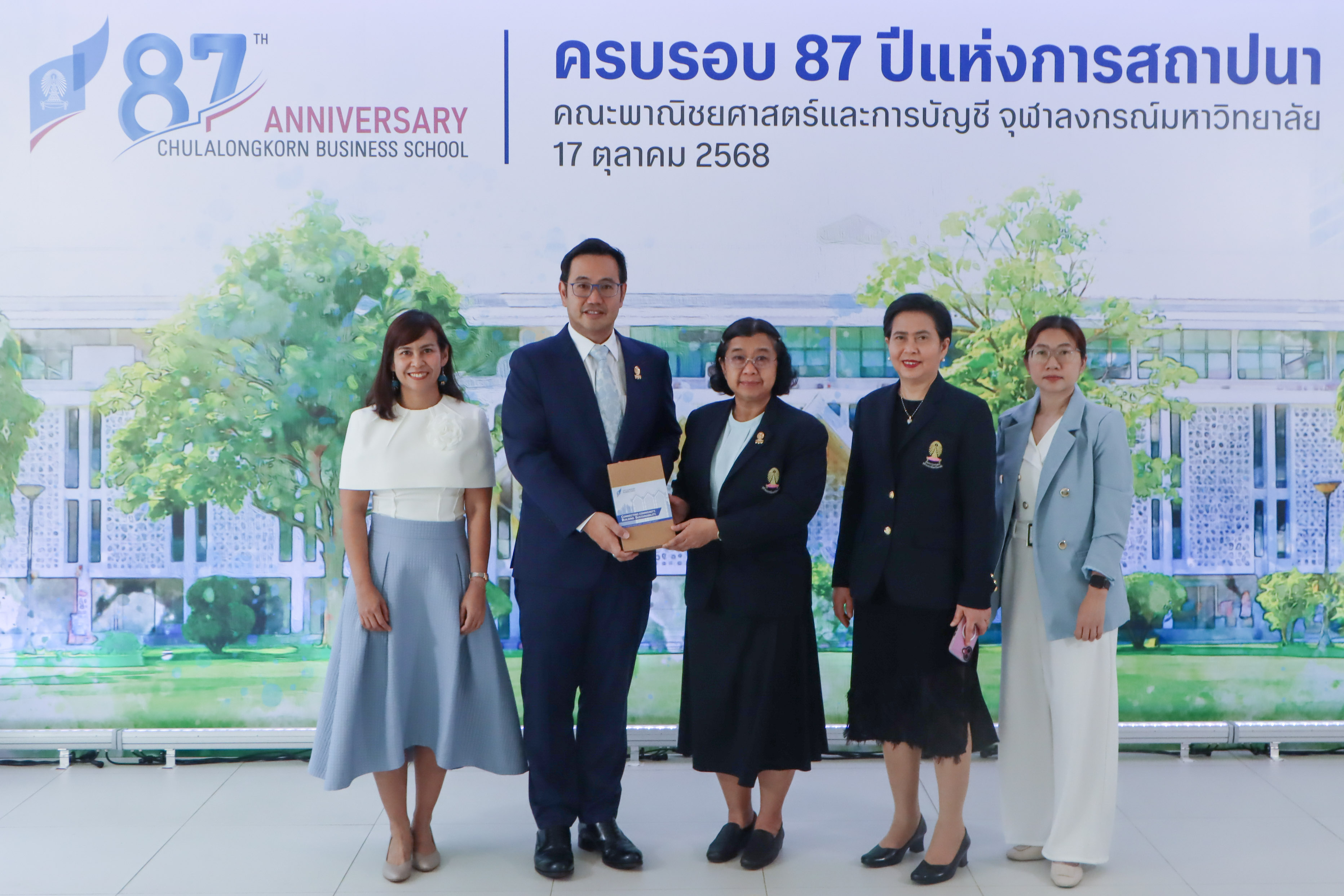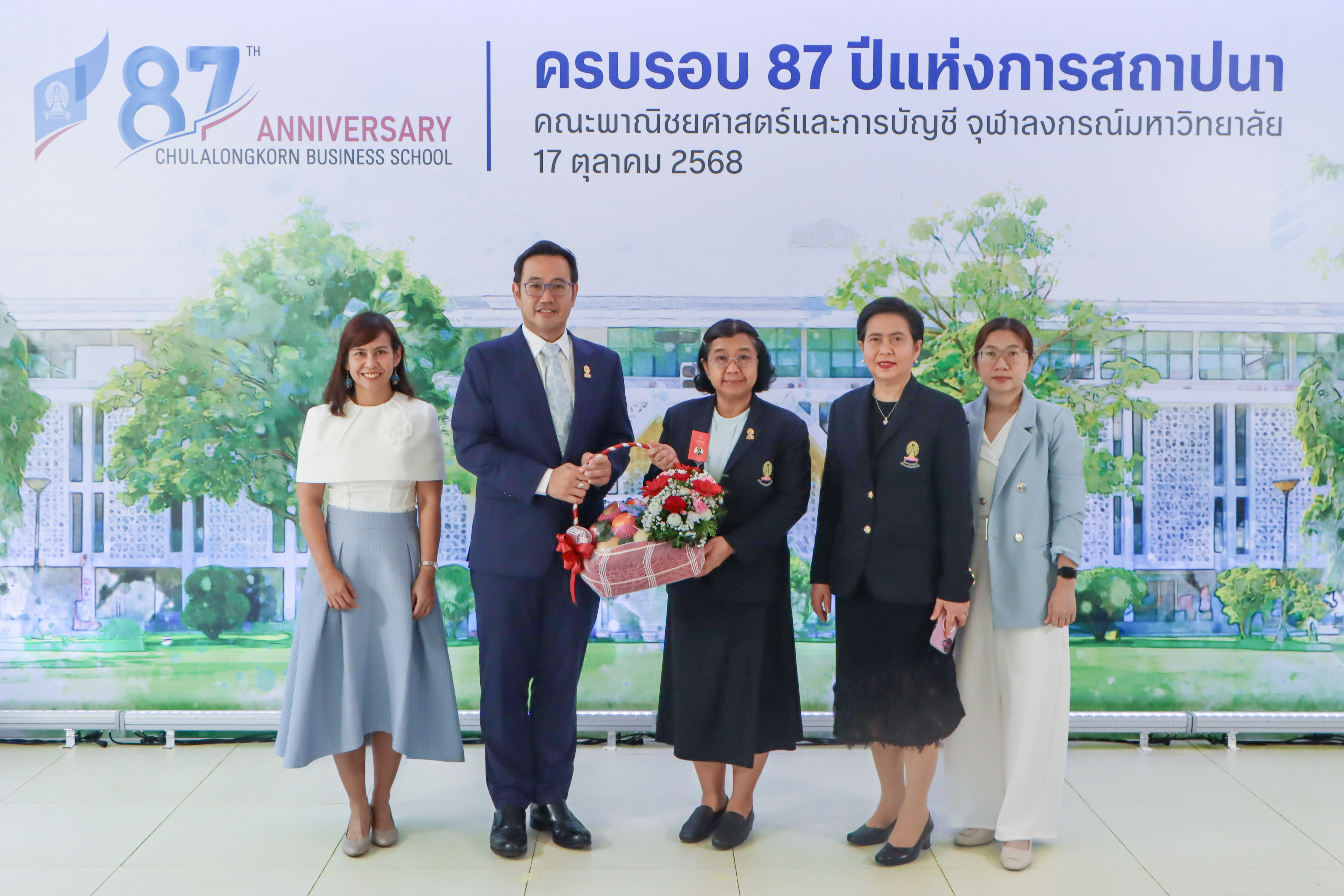 ศาสตราจารย์ ดร.ขำคม พรประสิทธิ์ คณบดีคณะศิลปกรรมศาสตร์ จุฬาลงกรณ์มหาวิทยาลัย และ นางวรรณา เจตนเสน ผู้อำนวยการฝ่ายบริหาร พร้อมด้วย นางสาวทัชชกร แก้ววรรณ เข้าร่วมแสดงความยินดี และอวยพรเนื่องในโอกาสครบรอบ 87 ปี แห่งการสถาปนาคณะพาณิชยศาสตร์และการบัญชี จุฬาลงกรณ์มหาวิทยาลัย ในวันศุกร์ที่ 17 ตุลาคม 2568 ณ CBS Lounge ชั้น 1 อาคารอนุสรณ์ 50 ปี