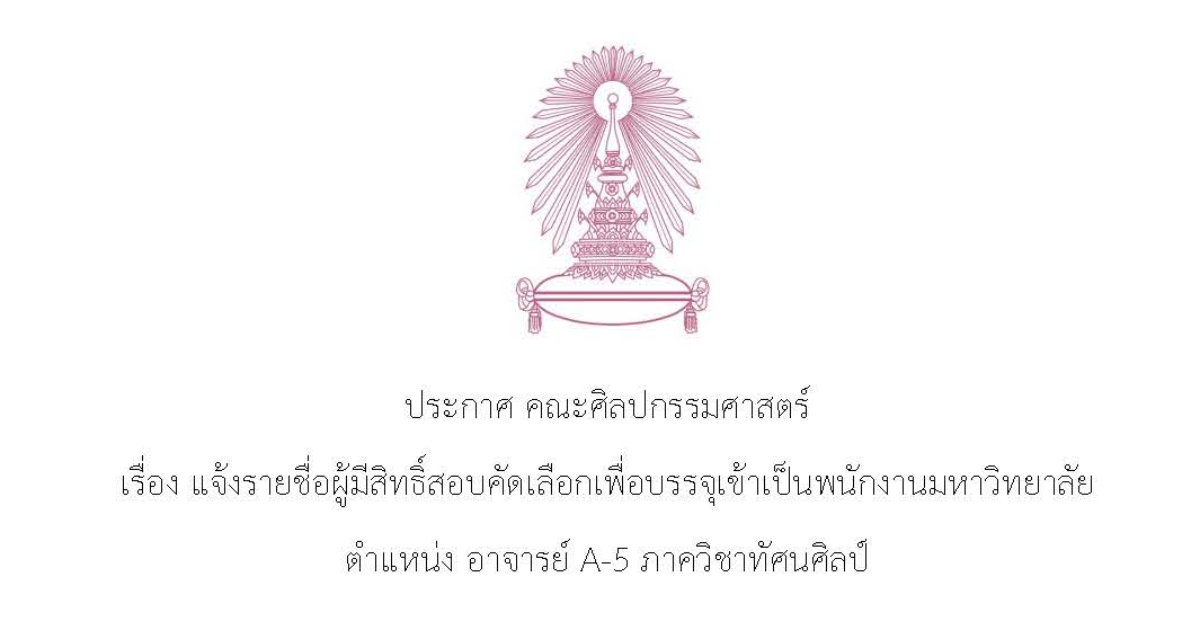 คณะศิลปกรรมศาสตร์ จุฬาลงกรณ์มหาวิทยาลัย ประกาศแจ้งรายชื่อผู้มีสิทธิ์สอบคัดเลือกเพื่อบรรจุเข้าเป็นพนักงานมหาวิทยาลัย ตำแหน่ง อาจารย์ A-5 ภาควิชาทัศนศิลป์