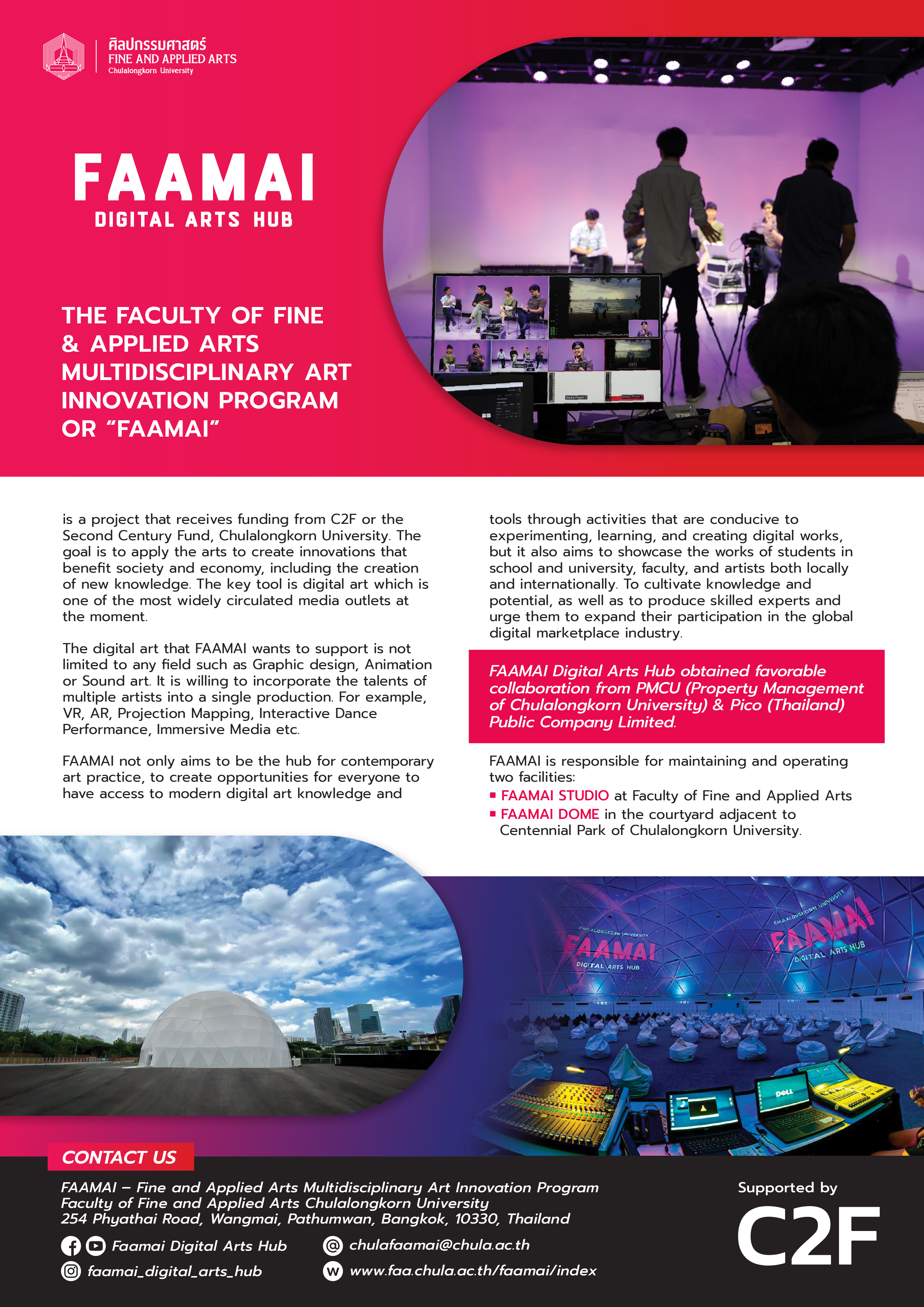 โครงการศูนย์ปฏิบัติการศิลปกรรมดิจิทัล หรือ FAAMAI (Faculty of Fine and Applied Arts Multidisciplinary Art Innovation Center) เป็นโครงการที่ได้ริเริ่มโดยคณาจารย์ในคณะศิลปกรรมศาสตร์ จุฬาลงกรณ์มหาวิทยาลัย ซึ่งต้องการพัฒนาศักยภาพของนิสิตและคณาจารย์ในด้านดิจิทัลอาร์ตให้ทัดเทียมกับระดับนานาชาติทั้งในแง่ของการสร้างสรรค์ผลงานและความรู้ในด้านเทคโนโลยี โครงการนี้จะไม่สามารถเกิดขึ้นได้เลย ถ้าไม่ได้รับการสนับสนุนด้านเงินลงทุนและความช่วยเหลือด้านการบริหารจัดการจาก C2F หรือ โครงการสร้างเสริมพลังจุฬาฯ กองทุนศตวรรษที่ 2 คณะทำงานในโครงการ FAAMAI หวังเป็นอย่างยิ่งว่าโครงการนี้จะสามารถช่วยสร้างคนรุ่นใหม่ใช้เทคโนโลยีอย่างสร้างสรรค์เพื่อรับมือกับยุคสมัยที่การกระทำของมนุษย์อาจส่งผลลัพธ์ใหญ่หลวงต่อโลก ทั้งด้านสิ่งแวดล้อม เศรษฐกิจ สังคม และสุขภาวะ